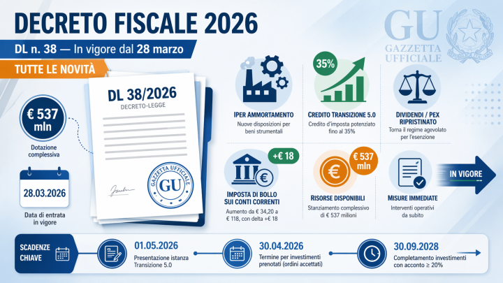 Le informazioni contenute in questo articolo hanno carattere divulgativo e si basano sul testo del DL n. 38/2026 pubblicato in Gazzetta Ufficiale il 27 marzo 2026. Trattandosi di un decreto legge, le disposizioni potrebbero essere modificate in sede di conversione parlamentare. Si consiglia di verificare eventuali aggiornamenti normativi o circolari applicative prima di adottare qualsiasi comportamento fiscale.